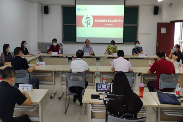 此次培训考核分为参训过程考核、技能展示考核两部分,参训过程考核包含参训教师集中培训、线上学习,微格教学训练,提交个人培训成果报告等环节,技能展示考核除对教师进行现场课堂教学评定外,还包括对教学设计及PPT的评定。培训考核邀请了校教学督导专家,各学院教学副院长,历届省级、校级青年教师授课竞赛获奖者担任评委,来自15个学院的21位评委及53名参训教师,以现场会议和线上会议同步进行的方式参加了培训考核启动仪式。参训教师分成7个组进行教学技能展示。每位教师从教学内容、教学组织、教学内容展示、教学语言与教态、教学特色等多个方面充分展示了自己的教学风采,评委对参训教师进行了现场评分。