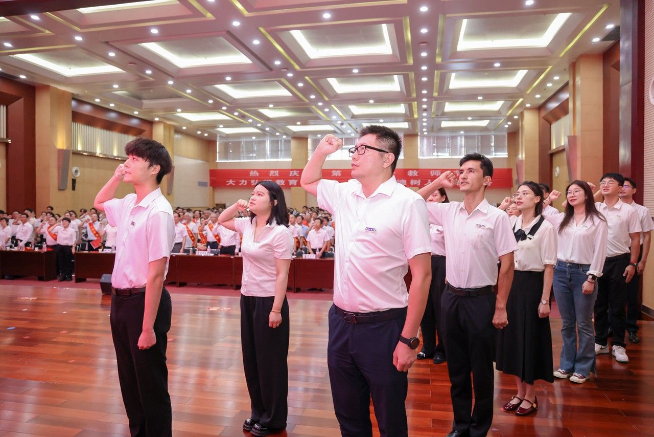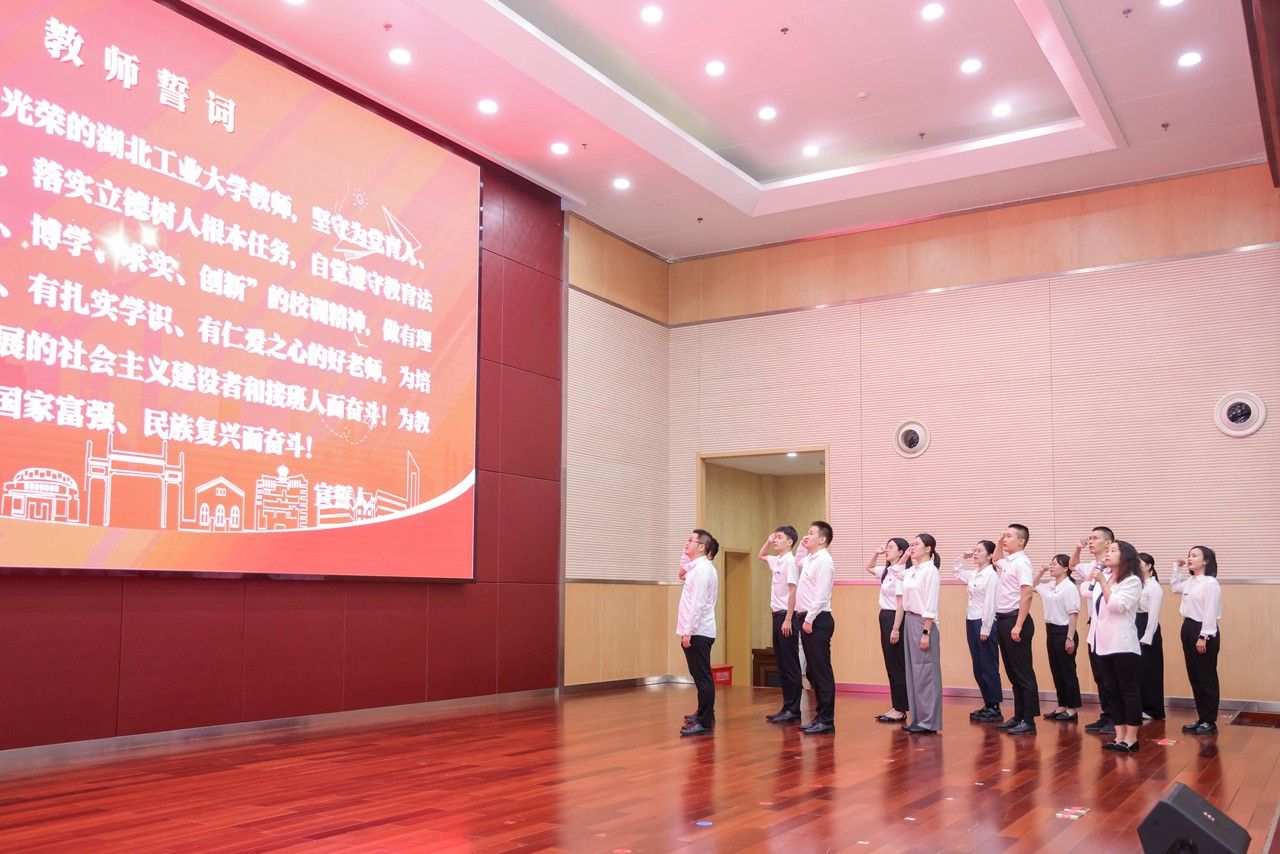 大会为106名新教师举行了入职仪式。由荣休教师代表为新教师佩戴校徽,并且在年度“荆楚好老师”、艺术设计学院王欣老师带领下,进行了庄严的教师宣誓。