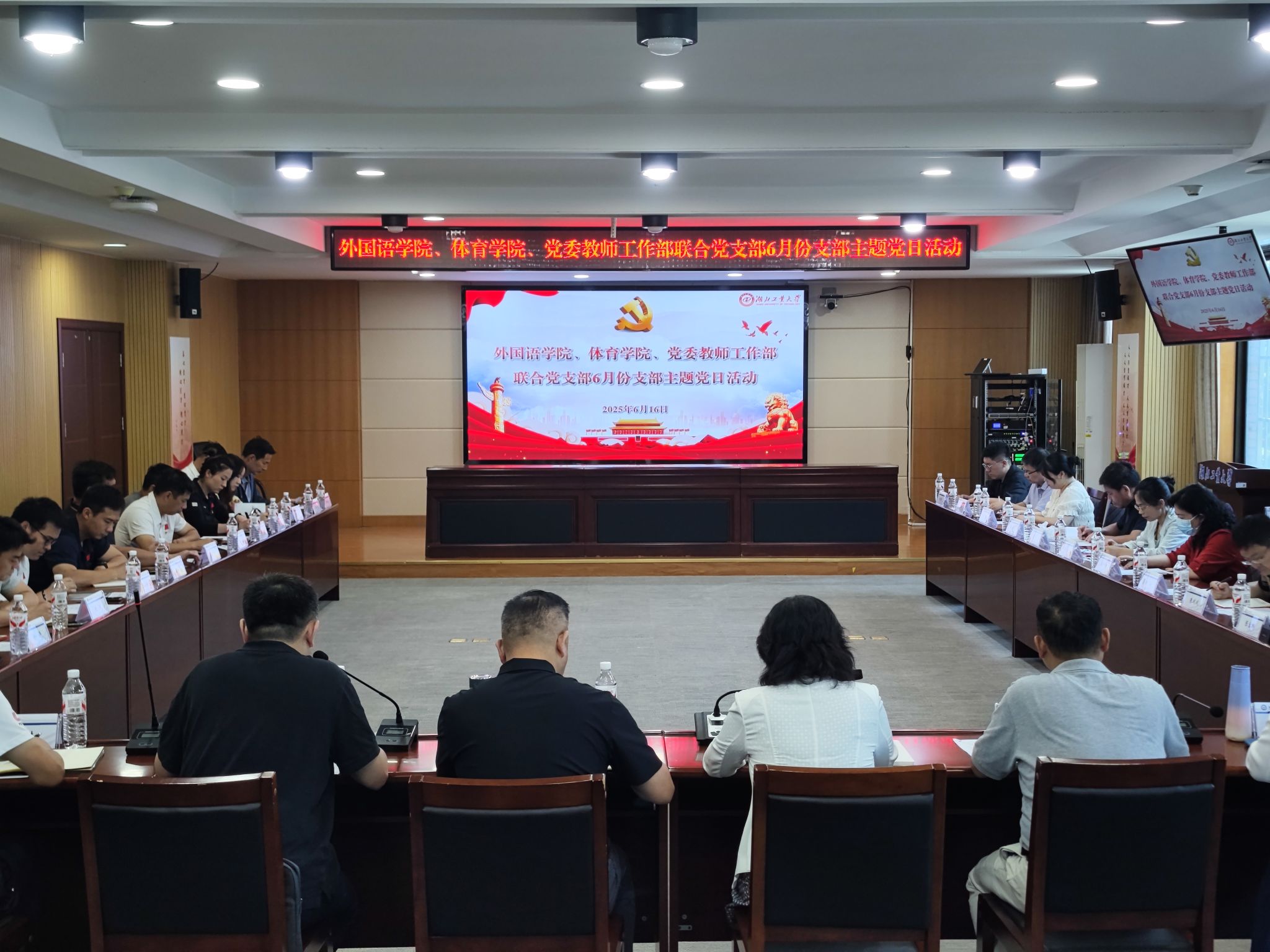 政治理论学习环节,教工部副部长韩东、外国语学院院长鲁修红、体育学院院长代永胜分别领学“习近平总书记近期的重要讲话、重要文章和重要回信精神”、“大力弘扬‘三大精神’”、“深入学习贯彻中央八项规定精神学习教育”并结合工作实际作交流发言。课程思政分享汇报环节,外国语学院教师陈宝琳和体育学院教师罗丽娜分别以“有根 有料 有光——人文课程思政教学实践交流”和“党建引领高校体育课程思政”为主题,分享了各自在课程思政实践中的宝贵经验和成功案例,展现出教书与育人的深入融合、育人与育己的高度统一。随后,外国语学院党委书记张志国和体育学院党委书记张家盛分别作师德师风建设工作经验交流。