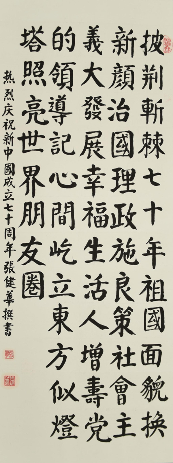 为了庆祝中华人民共和国成立70周年,张健华老人还挥毫作诗一首,表达自己激动的心情:披荆斩棘七十年,祖国面貌换新颜。治国理政施良策,社会主义大发展。幸福生活人增寿,党的领导记心间。屹立东方似灯塔,照亮世界朋友圈。